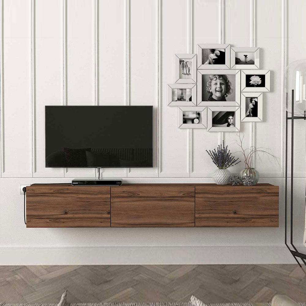 Meuble TV moderne en bois à design suspendu, de 3 portes battantes à finition Exclusive Marron Noyer chez Nembrohome'