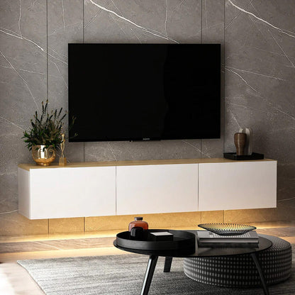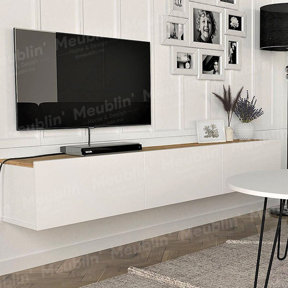Meuble TV suspendu PALM 180 cm à 3 portes - Blanc et chêne