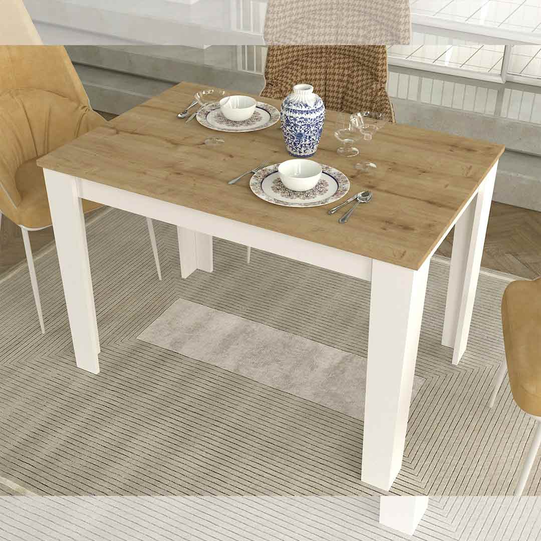 Table à manger moderne en bois à finition chêne, pieds et structure en blanc, pour espace cuisine ou salle à manger marocaine
